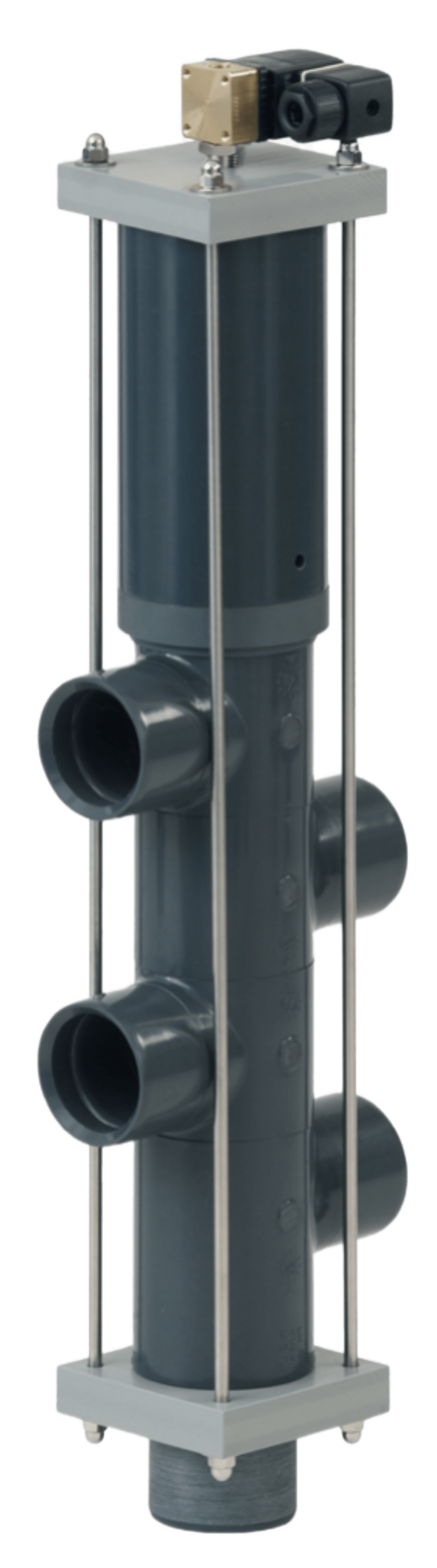 Das Ventil kann an jeden handelsüblichen Filter angeschlossen werden. Zusätzlich sind für bestehende Rohrleitungen die Anschlussstutzen verstellbar, dadurch werden Spannungen bei der Verrohrung vermieden. Alle Anschlüsse zum Rückspülautomaten sind innen bzw. aussen klebbar und sind mit PVC-U Rohren, Fittings und Armaturen herzustellen.