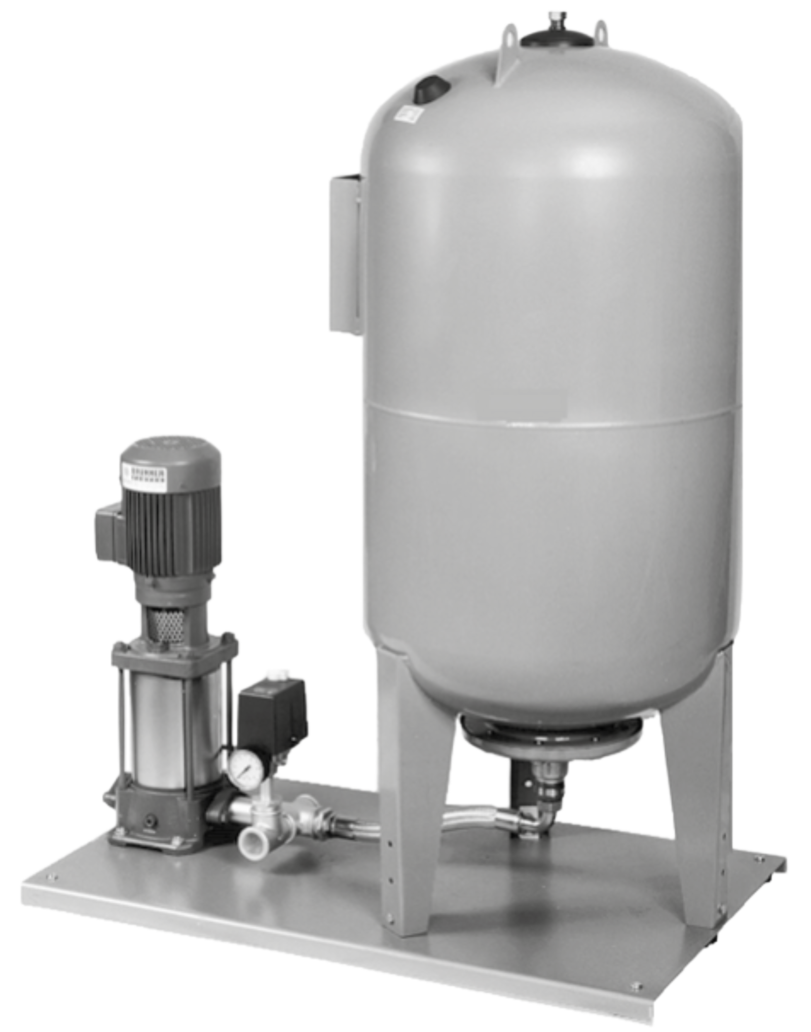 Die Anlagen bestehen aus einer vertikalen, geräuscharmen Kreiselpumpe, einem Membrandruckgefäss mit 100lt, 200lt (10 oder 16 bar) oder 300lt (10bar) Inhalt, einem Druckschalter, einem Manometer und einer internen rostfreien Verrohrung.